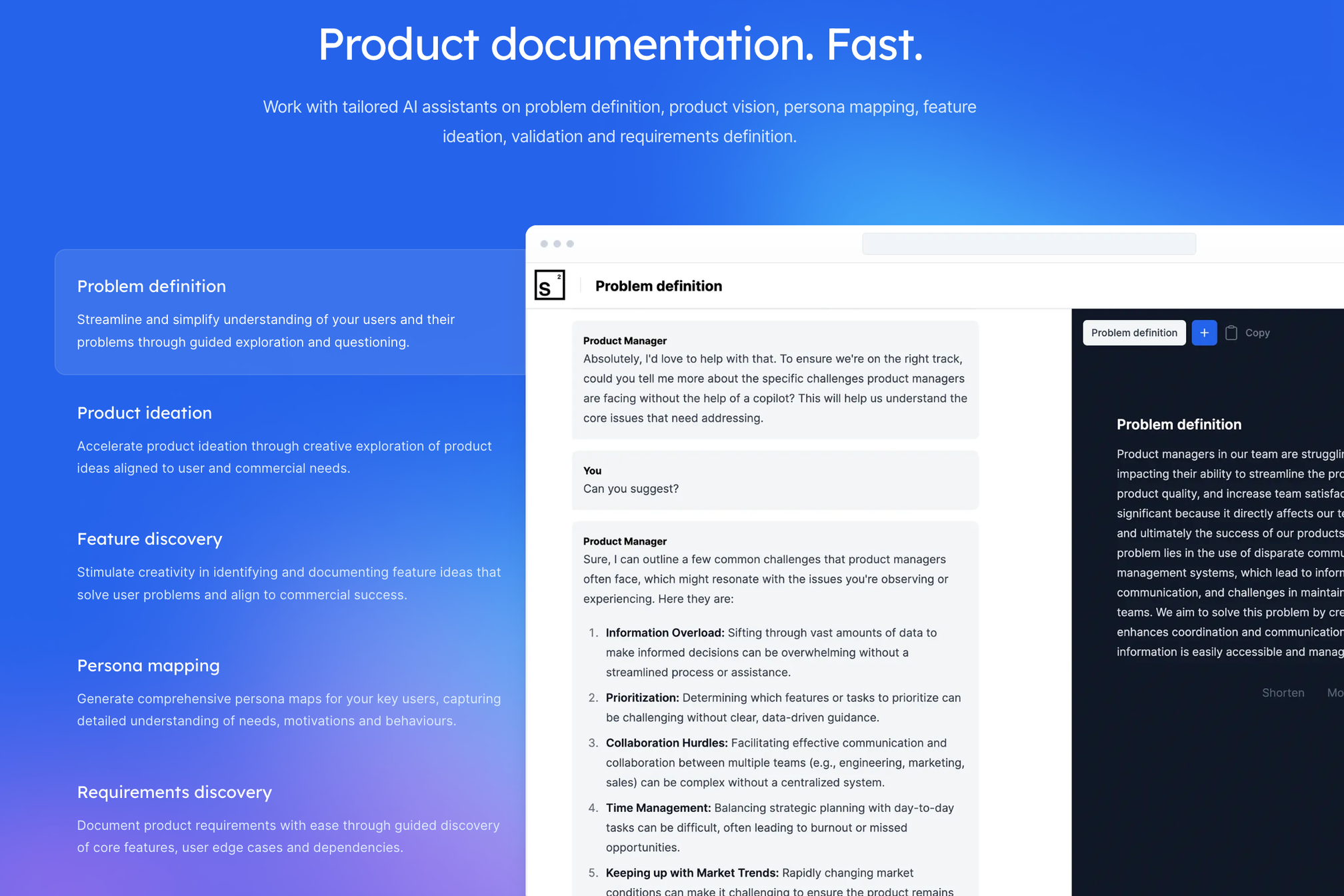 Product managers often face challenges in creating consistent, comprehensive documentation efficiently. There was a need for a tool that could assist in generating detailed product documents, facilitating organisation, and enabling easy sharing of information.